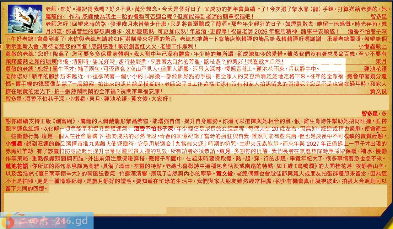 【1】.老師,您好。還記得我嗎?好久不見,萬分想念。今天是個好日子,又成功的把年會員續上了!今次選了紫水晶(龍)手錬,打算送給老婆的,她屬龍的。作為感謝谢她為我生二胎的禮物可否適合呢?但願能得到老師的簡單祝福吧!智多星