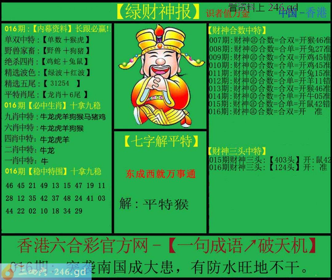 六合彩016期:绿色财神