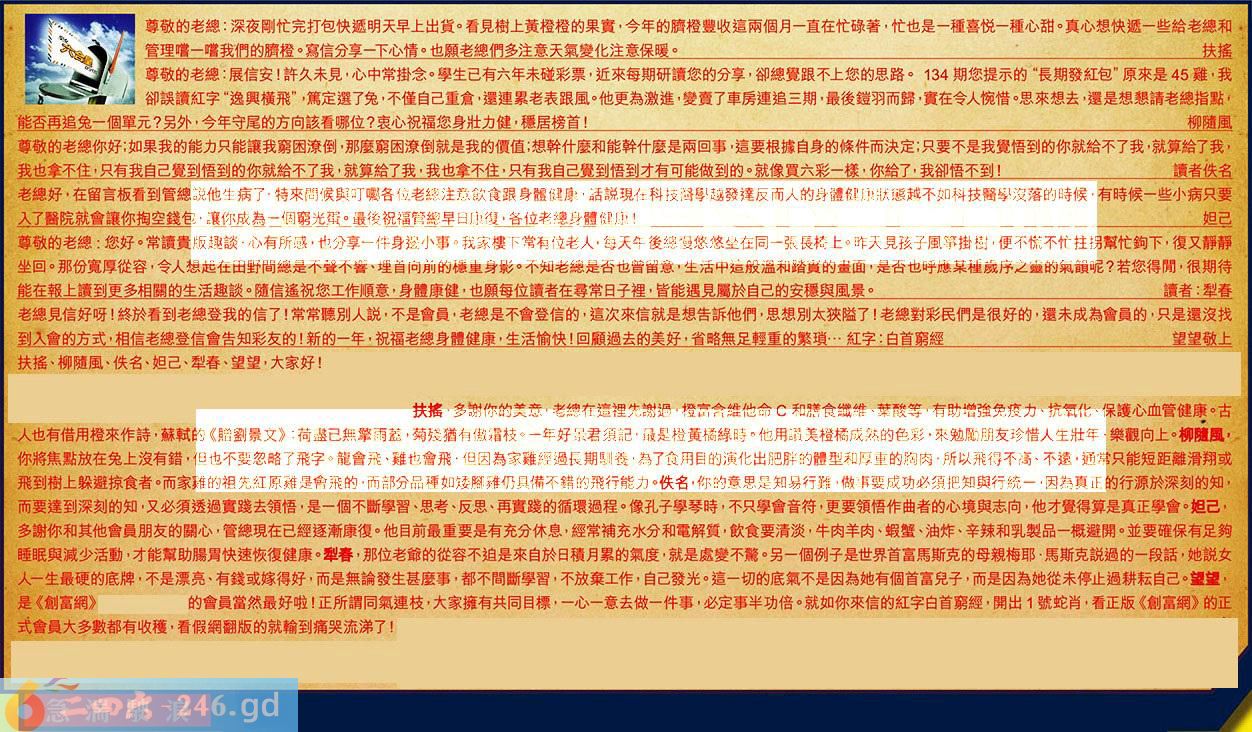【6】.老總見信好呀!終於看到老總登我的信了!常常聽别人説,不是會員,老總是不會登信的,這次來信就是想告訴他們,思想別太狭隘了!老總對彩民們是很好的,還未成為會員的,只是還沒找到入會的方式,相信老總登信會告知彩友的!新的一年,祝福老總身體健康,生活愉快!回顧過去的美好,省略無足輕重的繁琐...紅字:白首窮經望望敬上