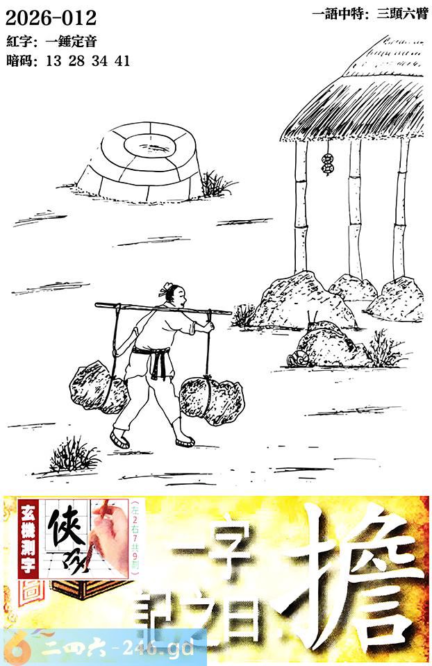 012期跑狗一字記之曰:【擔】 長桿擔起,雙石隧懸。 足沾塵土,步步向前。 玄機測字:《俠》 一語中特:三頭六臂