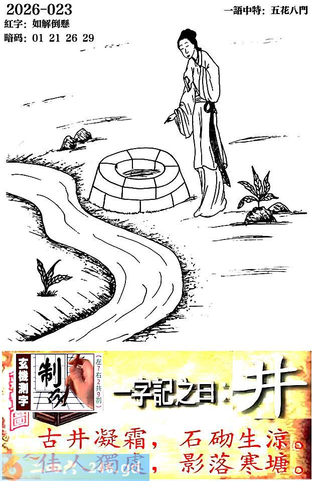 六合彩023期跑狗一字記之曰:【井】 古井凝霜,石砌生涼。 佳人獨處,影落寒塘。