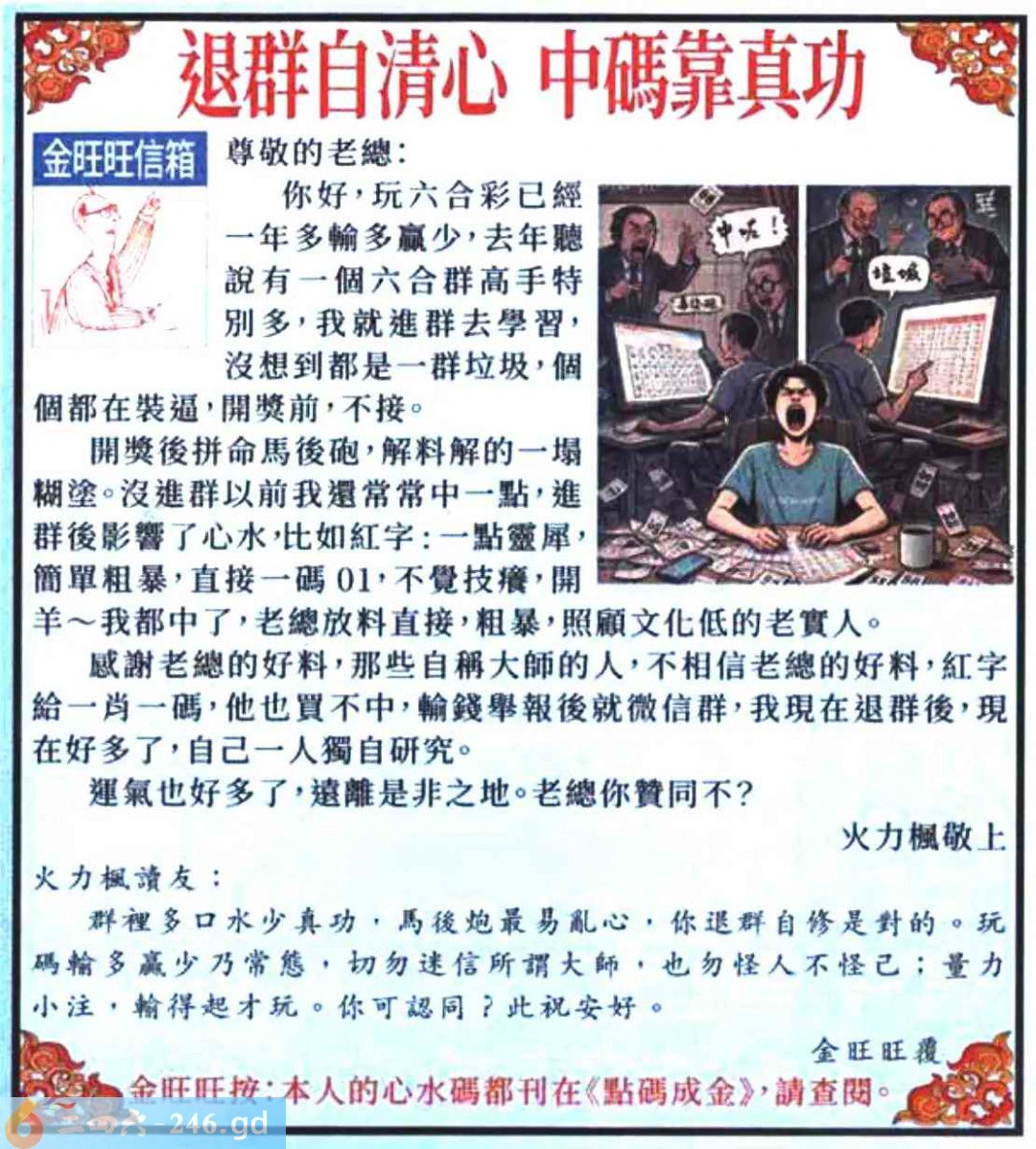 六合彩032期:金旺旺信箱彩民推荐→→《退群自清心 中碼靠真功》