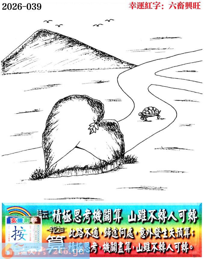 039期老版跑狗一字記之曰:【算】 詩雲:積極思考機關算,山雖不轉人可轉。 此路不通,歸途何處,意外發生失預算; 積極思考,機關算盡,山雖不轉人可轉。 玄機測字:《按》