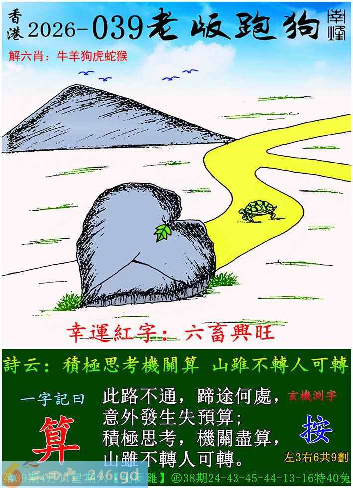 六合彩039期老版跑狗一字記之曰:【算】 詩雲:積極思考機關算,山雖不轉人可轉。