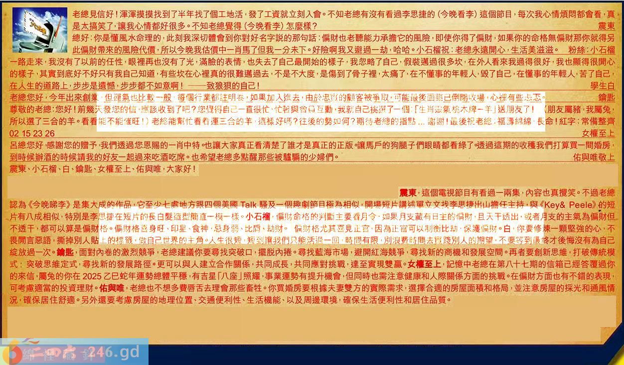【5】.尊敬的老總:您好!前幾天發您的信應該收到了吧?您覺得自己一直很忙,忙著與會員互動,我就自己挑選了一個:「生肖靈氣桃木牌一羊」送朋友了!(朋友屬豬,我屬兔,所以選了三合的羊。看看能不能催旺)老總能幫忙看看運三合的羊,這樣好嗎?往後的勢如何?期待老總的指點...謝謝!最後祝老總::福壽綿綿,長命!紅字:常備整齊02152326女權至上