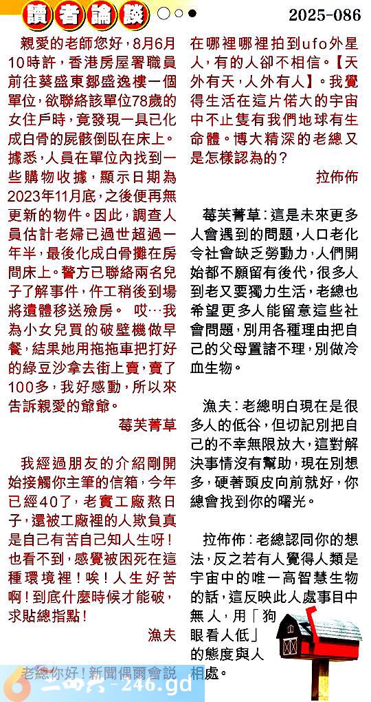 1.親愛的老師您好,8月6月10時許,香港房屋署職員前往葵盛東鄒盛逸樓一個單位,欲聯絡該單位78歲的女住戶時,竟發現一具已化成白骨的屍骸倒臥在床上。據悉,人員在單位內找到些購物收據,顯示日期為2023年11月底,之後便再無更新的物件。因此,調查人員估計老婦已過世超過年半,最後化成白骨攤在房間床上。警方已聯絡兩名兒子了解事件,许工稍後到場將遗體移送殮房。哎...我為小女兒買的破壁機做早餐,結果她用拖拖車把打好的緣豆沙拿去街上賣,賣了100多,我好感動,所以來告訴親愛的爺爺。莓芙菁草