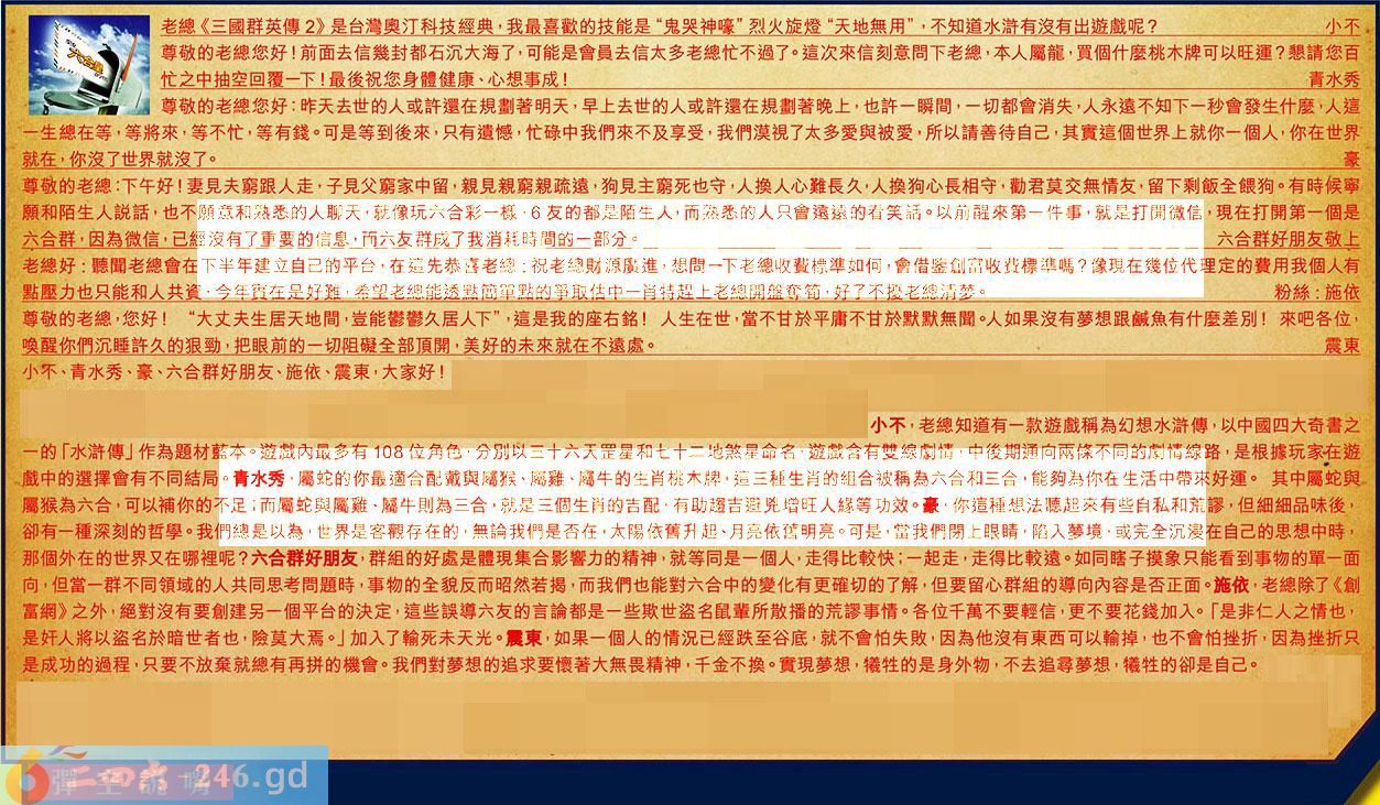【4】.尊敬的老總:下午好!妻見夫窮跟人走,子見父窮家中留,親見親窮親疏遠,狗見主窮死也守,人換人心難長久,人換狗心長相守,勸君莫交無情友,留下剩飯全餵狗。有時候寧願和陌生人說話,也不願意和熟悉的人聊天,就像玩六合彩一樣,6友的都是陌生人,而熟悉的人只會遠遠的看笑話。以前醒來第一件事:就是打開微信,現在打開第一個是六合群,因為微信,已經沒有了重要的信息而六友群成了我消耗時間的一部分。六合群好朋友敬上