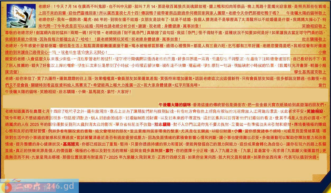 【6】.老總,給你來信了,買了九運符。運氣蹭蹭的往上漲,效果嘎嘎滴。會員朋友如果運氣差點,買張符來增加運氣。話說老總這次出這个新符,只有會員朋友知道,很多都說沒聽過,也難怪。他們又不是會員,關鍵時刻看盗版資料給人馬賽克了。希望能再上報大力推廣次。祝大家身體健康。紅字月落烏啼。紫竹