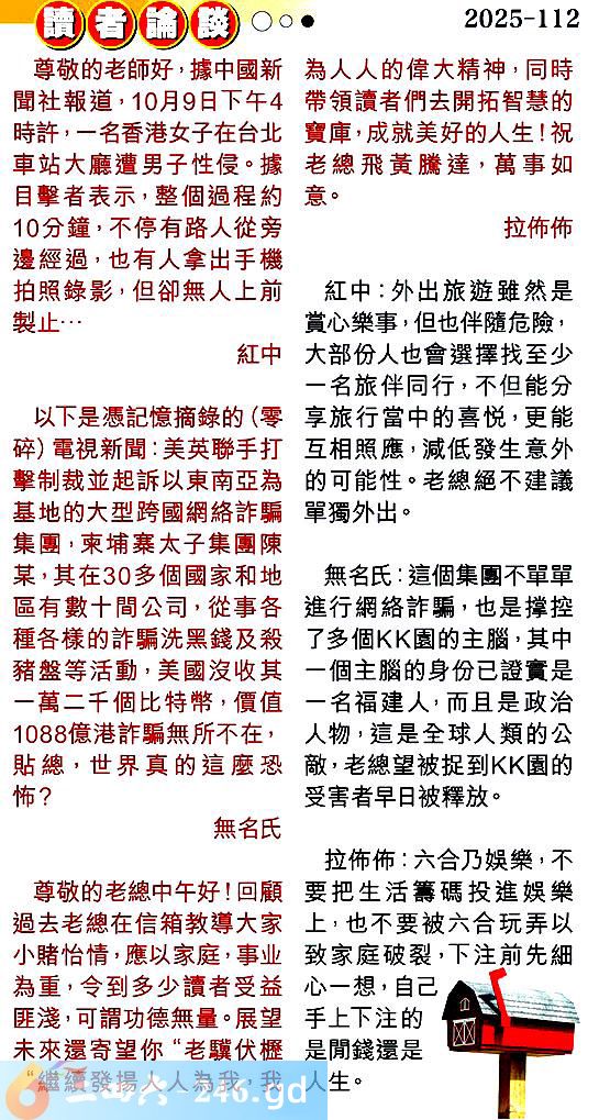 3.尊敬的老總中午好!回顧過去老總在信箱教導大家小賭怡情,應以家庭,事业為重,令到多少讀者受益匪淺,可謂功德無量。展望未來還寄望你“老驥伏櫪“繼續發揚人人為我,我為人人的偉大精神,同時帶領讀者們去開拓智慧的寶庫,成就美好的人生!祝老總飛黃騰達,萬事如意。拉佈佈