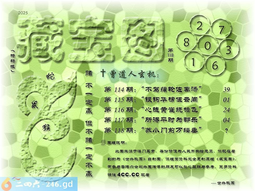 118期藏寶圖 新:苏小门前万缕垂 老:伴人东去到江城 禁:羊禁:5尾玄機字:《存》