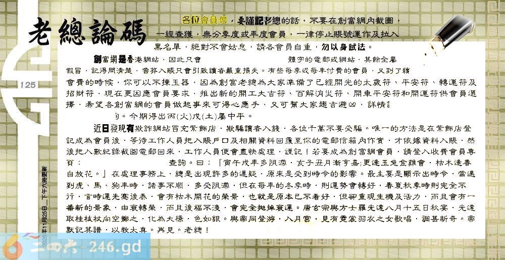 六合彩125期:六合皇金句/老总论码/萧公子/林大师/五行夺码/老总信箱截图