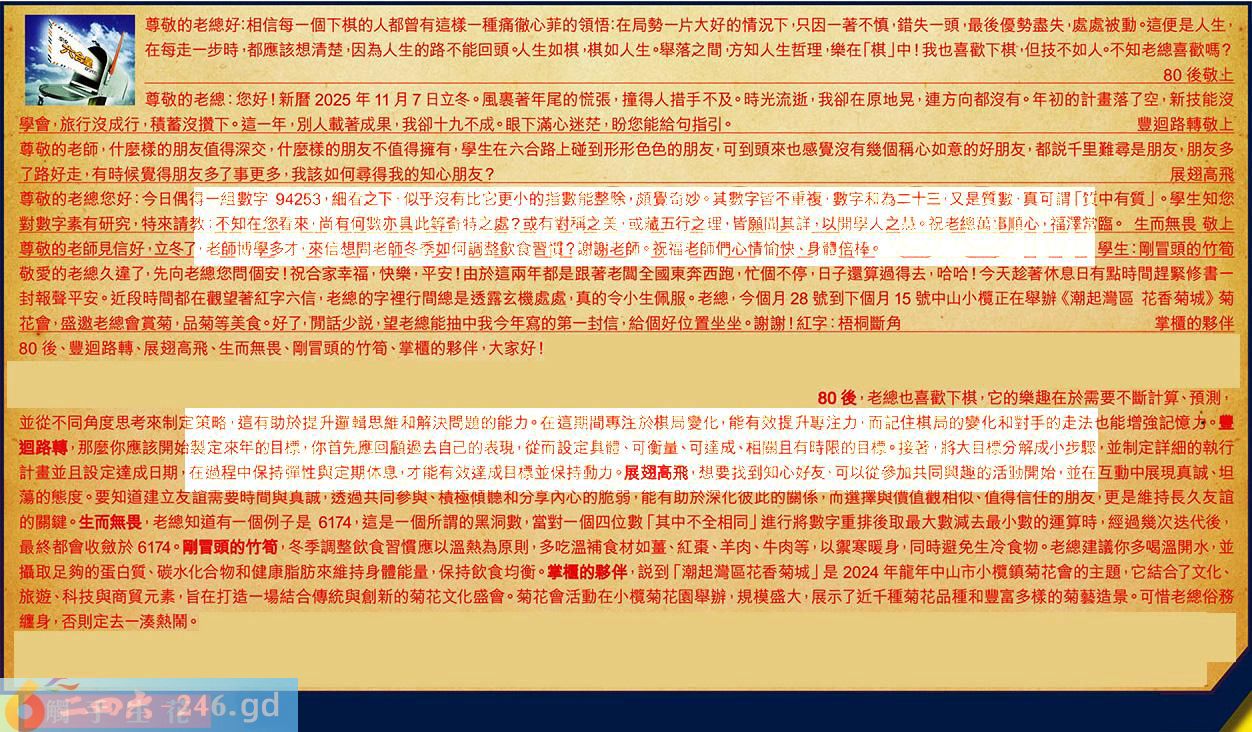 【6】.敬愛的老總久違了,先向老總您問個安祝合家幸福,快樂,平安!由於這兩年都是跟著老闆全國東奔西跑,忙個不停,日子還算過得去,哈哈!今天趁著休息日有點時間趕緊修書一封報聲平安。近段時間都在觀望著紅字六信,老總的字裡行間總是透露玄機處處,真的令小生佩服。老總,今個月28號到下個月15號中山小欖正在舉辦《潮起灣區花香菊城》菊花會,盛邀老總會賞菊,品菊等美食。好了,閒話少說,望老總能抽中我今年寫的第一封信,給個好位置坐坐。謝謝!紅字:梧桐斷角掌櫃的夥伴