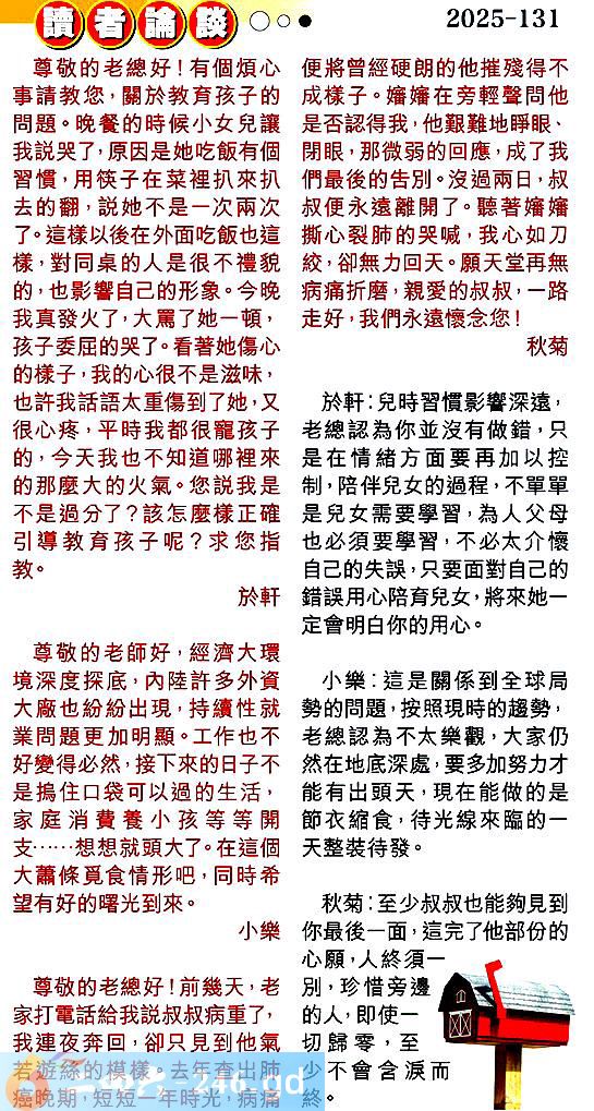 〖於軒〗:兒時習慣影響深遠,老總認為你並沒有做錯,只是在情緒方面要再加以控制,陪伴兒女的過程,不單單是兒女需要學習,為人父母也必須要學習,不必太介懷自己的失誤,只要面對自己的錯誤用心陪育兒女,將來她一定會明白你的用心。