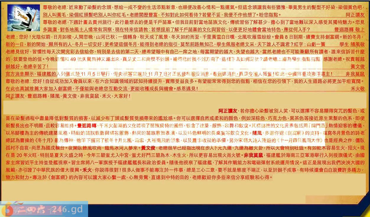 【3】.老總:您好!光陰似箭,日月如梭,人間忽晚,山河已秋;一個轉身,秋天成了風景,冬天如約而至,千里黃雲白日曛,北風吹雁雪紛紛。會員8日到期,續費支持創富網。新的冬月,新的一日,新的開始,願所有的人,冬月一切安好;更希望這個冬月,能得到老總的指引,莫愁前路無知己,學生佩服老總文采,天下誰人不識君?紅字:山虧一簧學生隨風敬