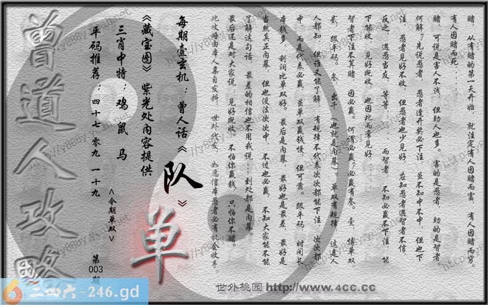 003期藏寶圖 新:君今旧隐治叁径 老:交游相见休相问 禁:狗禁:3尾玄機字:《队》