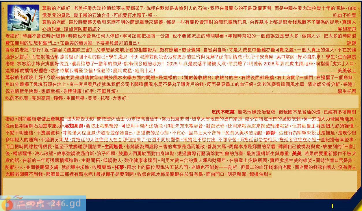 【5】.老總,求您給小妹安排個好位置,讓我這憋了一整年的動兒,能有個發威的地方!2025年真是虎落平陽彼犬欺,憋屈壞了;眼嗆著2026年要虎虎生周地來,盼指個「虎穴」入口,這頭餓虎撲得好獵物,求老總慧我轉運登信!祝老總:龍精虎猛,威風十足美美敬上
