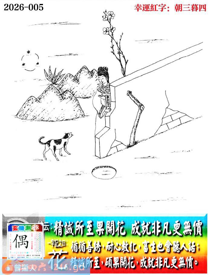 005期老版跑狗一字記之曰:【花】 詩雲:精誠所至果開花,成就非凡更無價。 循循善誘,耐心放化,畜生也會聽人話; 精誠所至,碩果開花,成就非凡更無價。 玄機測字:《偶》