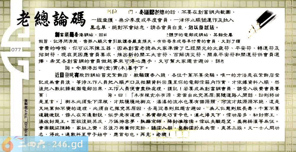 六合彩077期:六合皇金句/老总论码/萧公子/林大师/五行夺码/老总信箱截图