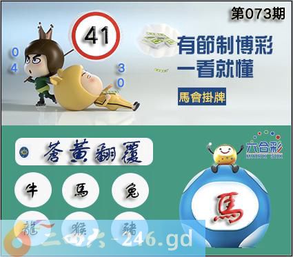073期正版彩图挂:41爆:马挂牌成语:苍黄翻复挂牌出肖:牛马兔龙猴猪