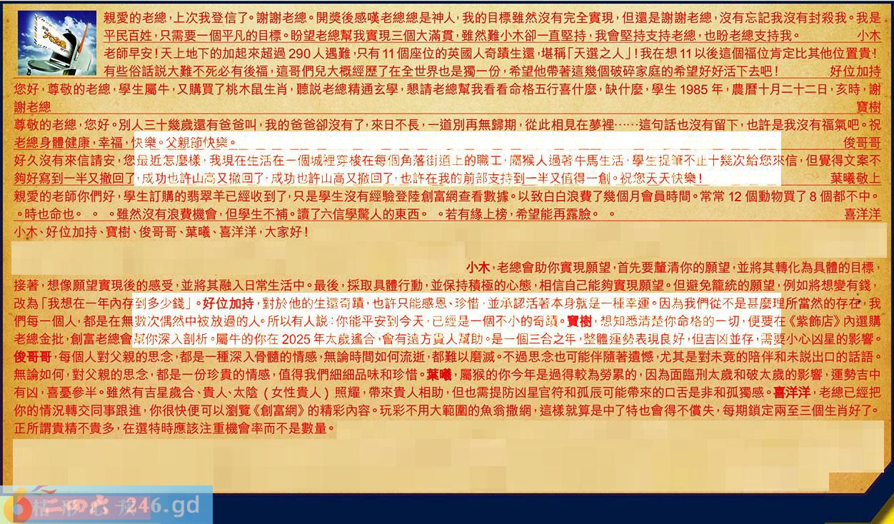 【6】.親愛的老師你們好,學生訂購的翡翠羊已經收到了,只是學生沒有經驗登陸創富網查看數據。以致白白浪費了幾個月會員時間。常常12個動物買了8個都不中。時也命也。。。雖然沒有浪費機會,但學生不補。讀了六信學驚人的東西。。若有緣上榜,希望能再露臉。。喜洋洋