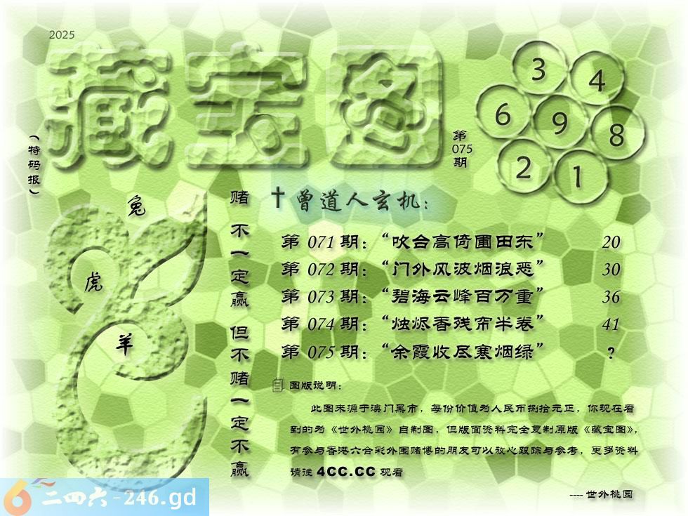 075期藏寶圖 新:余霞收尽寒烟绿 老:当年拼却醉红颜 禁:马禁:7尾玄機字:《道》