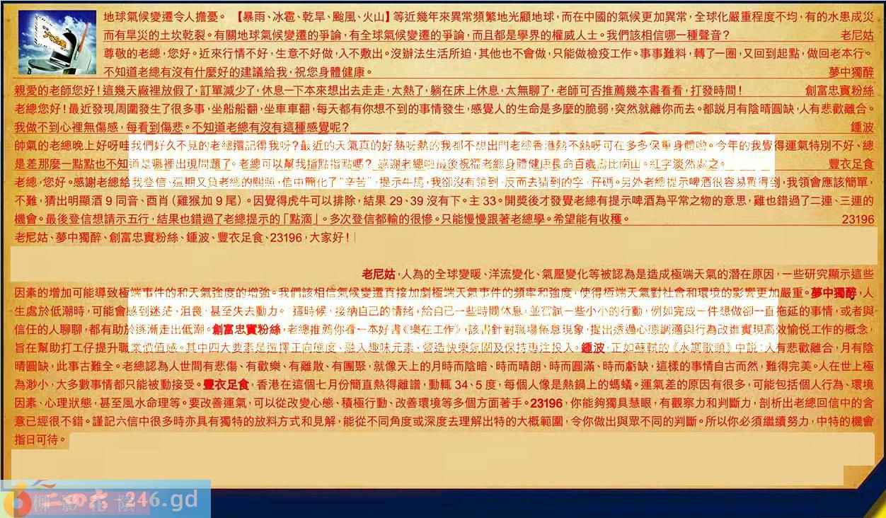 【6】.老總,您好感謝老總給我登信,這期又負老總的關照,信中商化了“辛苦”,提示牛馬,我卻沒有領到,反而去猜到的字孖碼。另外老總提示啤酒很容易買得到,我領會應該簡單,不難,猜出明顯酒9同音、酉肖(雞猴加9尾)。因覺得虎牛可以排除,結果29、39沒有下。主33。開獎後才發覺老總有提示啤酒為平常之物的意思,雞也錯過了二連、三連的機會。最後登信想請示五行,結果也錯過了老總提示的「點滴」。多次登信都輸的很惨。只能慢慢跟著老總學。希望能有收穫。23196