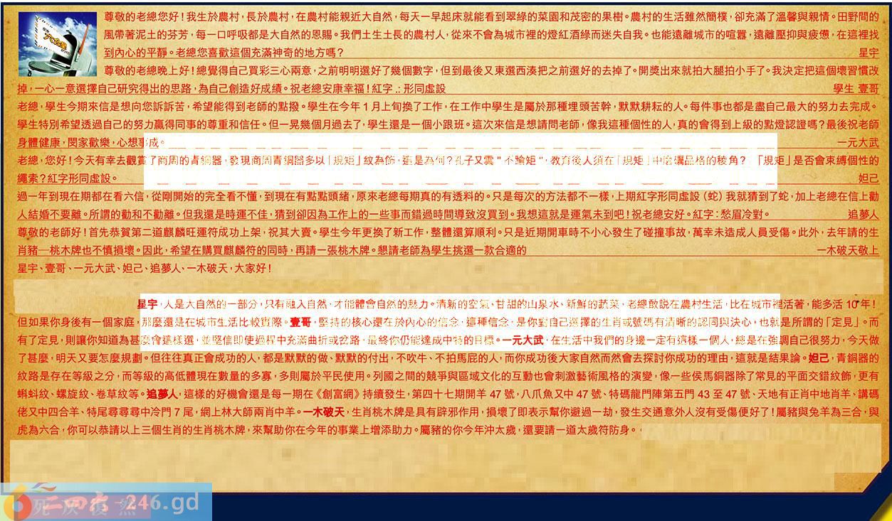 【5】.過一年到現在期都在看六信,從剛開始的完全看不懂,到現在有點點頭緒,原來老總每期真的有透料的。只是每次的方法都不一樣,上期紅字形同虛設(蛇)我就猜到了蛇,加上老總在信上勸人結婚不要離。所謂的勸和不勸離。但我還是時運不佳,猜到卻因為工作上的一些事而錯過時間導致沒買到。我想這就是運氣未到吧!祝老總安好。紅字:愁眉冷對。追夢人