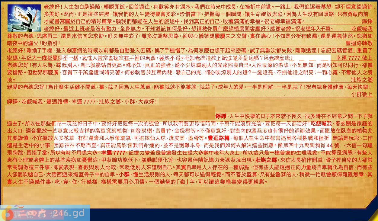 【4】.老總好!剛換了手機,登入創富網的時候以前都是自動登入密碼,換了手機懵了,為何怎麼也想不起來密碼,試了無數次都失敗,剛剛透過「忘記密碼管道」重置了密碼,年紀大一歲都覺得不一樣,忘性大常常去找拿在手裡的東西,哭笑不得。不知老總請教下記性變差是病嗎?祝老總安康!幸運7777敬上
