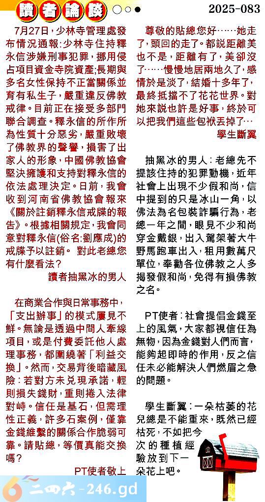 1.7月27日,少林寺管理處發布情況通報:少林寺住持釋永信涉嫌刑事犯罪,挪用侵占項目資金寺院資產;長期與多名女性保持不正當關係並育有私生子,嚴重違反佛教戒律。目前正在接受多部門聯合調查。釋永信的所作所為性質十分惡劣,嚴重敗壞了佛教界的聲譽,損害了出家人的形象,中國佛教協會堅決擁護和支持對釋永信的依法處理決定。日前,我會收到河南省佛教協會報來《關於註銷釋永信戒牒的報告》。根據相關規定,我會同意對釋永信(俗名:劉應成)的戒牒予以註銷。對此老總您有什麼看法?讀者抽黑冰的男人